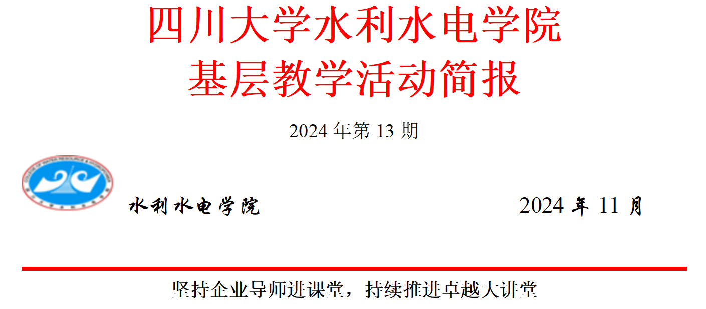 为进一步培养本科生及研究生的工程实践能力,丰富工程建设经验,水利水电工程系分别于2024年10月18日、10月25日和11月1日,特邀请国家能源局大坝安全监察中心信息技术中心副主任傅春江、中国水利水电第七工程局有限公司周强、中国电建集团成都勘测设计研究院勘测设计分公司副总工张丹,为学生做题为《数智化助力大坝安全管控提升》、《大型水电站EPC管理智能建造及地下洞室群关键施工技术》、《高土石坝的设计与建设》的专题报告。