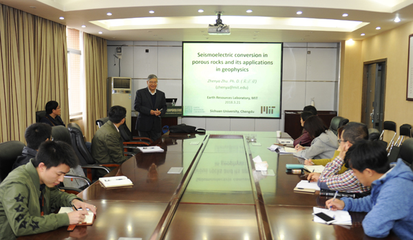讲座中,朱教授介绍说,震电转换是声能与电能相互转换的一种现象,当声波在充液的孔隙介质中传播时,由于固、液界面的双电层,声波引起液体中自由电荷的移动,激发了电场和磁场。这种声能与电能的转换称之为震电效应。