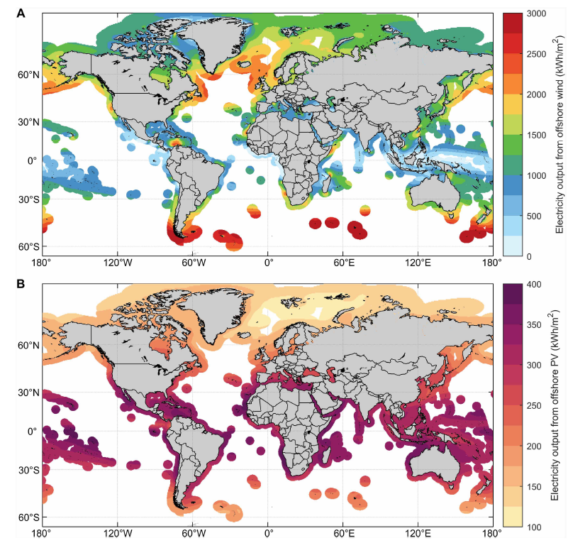 图1 海上风能和太阳能光伏每单位面积潜在年发电量的全球分布