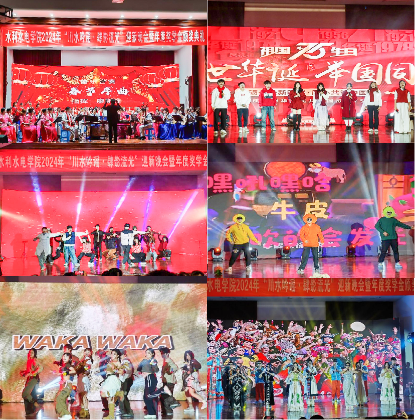 晚会特邀川大离退休教职工乐团、JAVSB85岁退休教师孙清茂老师演出,《红色娘子军印象(组曲)》、诗朗诵《冲向科学的课堂》等节目让同学们感受老一辈川大人的精神风貌,鼓舞了同学们青春报国的热情;舞蹈串烧《爱你+改革春风吹满地》活力四射,点燃了会场的氛围;歌曲《我爱你中国》激昂有力,引起大家共鸣;民族特色节目《民族团结·爱我中华》结合民族服饰与舞蹈元素展现灿烂多元的中华民族文化。第二篇章“流光·生华”在优美温柔的钢琴曲《火花·魔女》中徐徐展开;凤鸣川大冠军王景希带来歌曲《给电影人的情书》,以完美的声线和细腻的情感征服现场观众;歌曲演唱《一程山路》纯真悠扬,展现了水电学子积极向上的青春风貌;舞蹈串烧《炫彩童影:跨次元舞蹈风暴》带领大家重回童年时光,将晚会的氛围再度推向高潮;歌曲串烧《少年如你》引起热烈合唱,展现了水电学子青春洋溢、冲破万难的气势如虹;最后,晚会在舞蹈《let's dance》中落下帷幕。