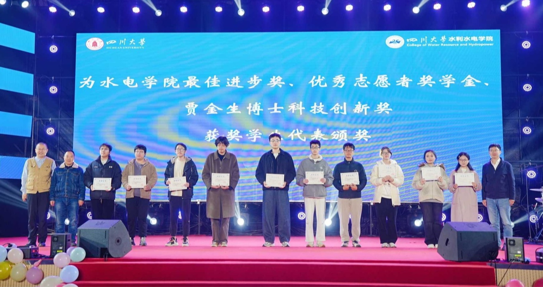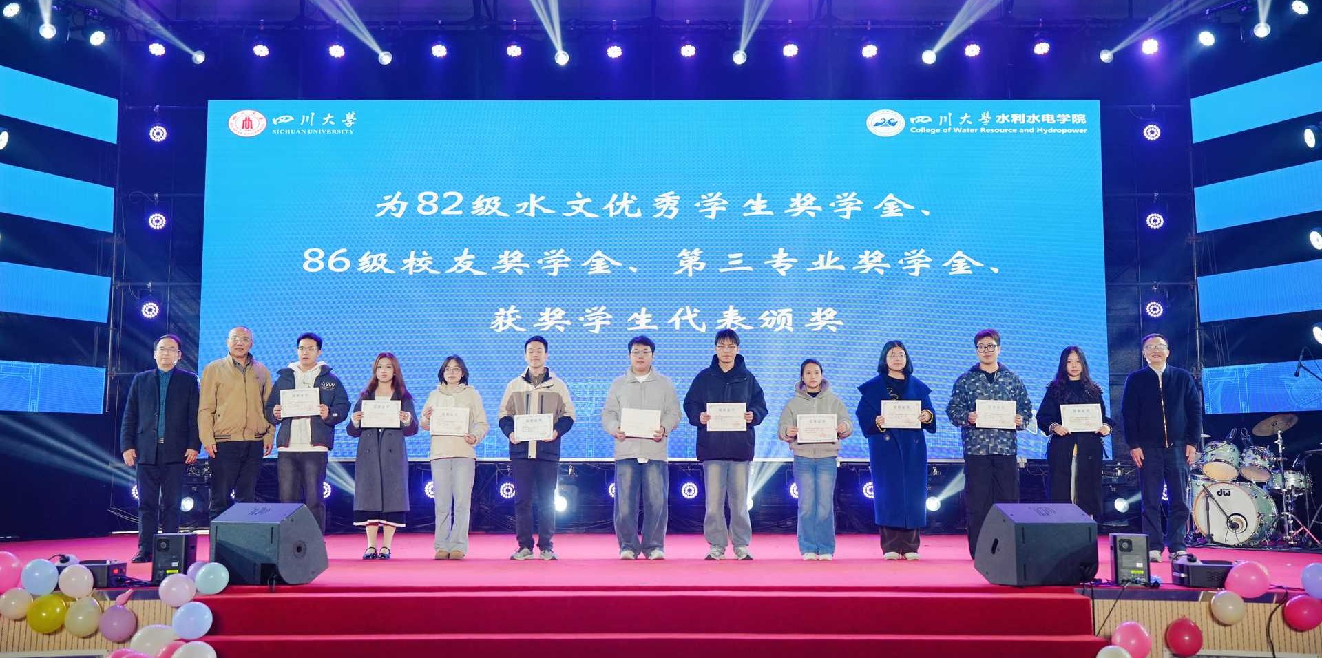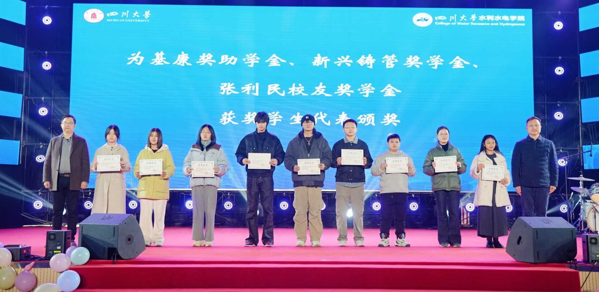 “川水摇星,新舟渡梦”2025年迎新晚会暨年度奖学金颁奖典礼隆重举行。学院党委书记吴刚、院长杨兴国等领导班子成员,基康仪器股份有限公司销售总监牟晋民,中建八局水利水电分公司助理经理徐玲等企业代表,校友代表赵毅、江文清、王东、邓元亮、周焕明,以及各系室(所)教师代表、辅导员、获奖学生代表和2025级全体新生出席活动。