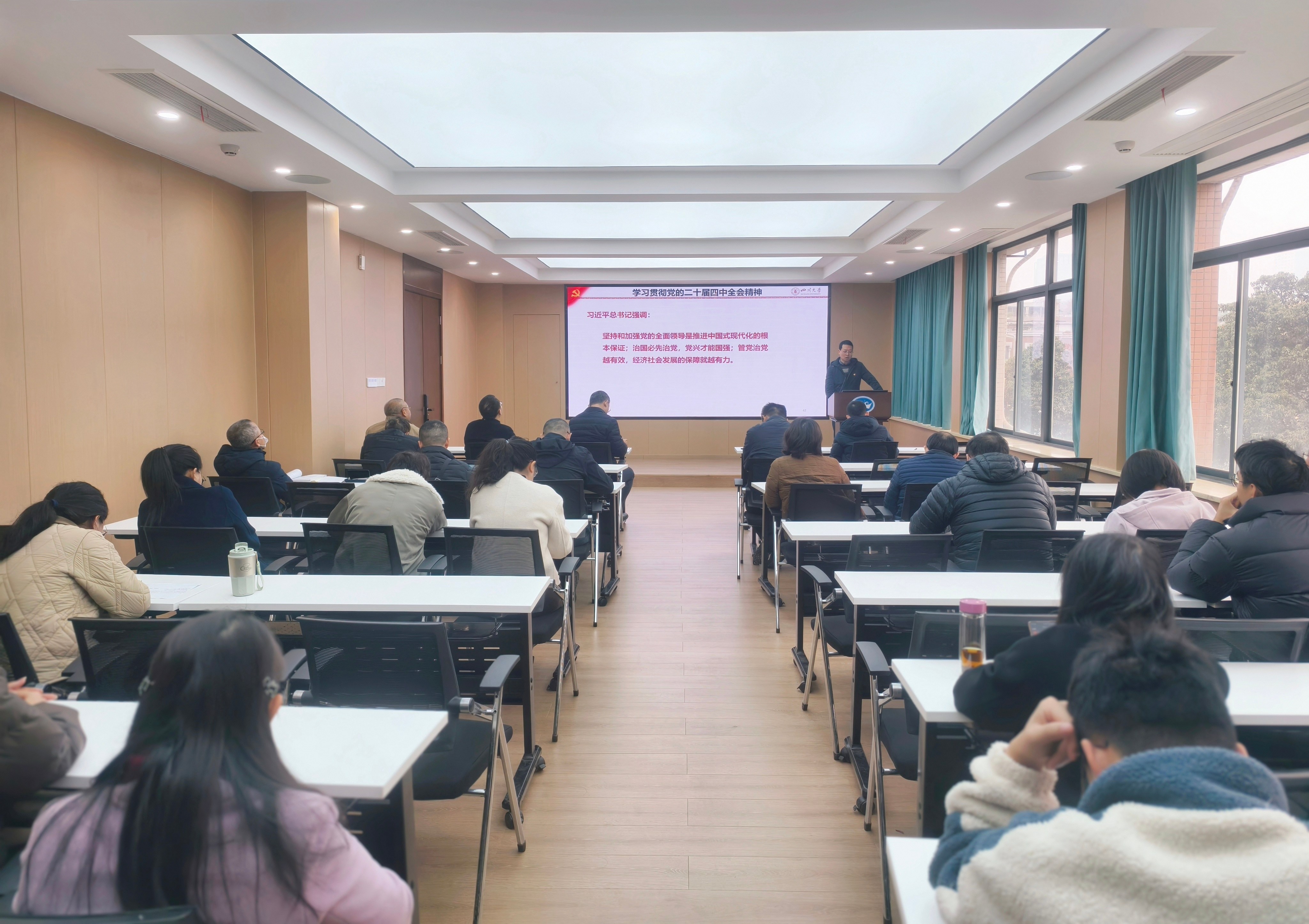 举行学习贯彻党的二十届四中全会精神宣讲会。学校党的二十届四中全会精神宣讲团成员、发展规划处副处长文宇峰应邀作专题辅导报告。学院党委书记吴刚、院长杨兴国等全体领导班子成员、两委委员、全国重点实验室领导、工会主席、专职组织员、科级干部、各系(所、中心)负责人和师生党支部书记参加学习。宣讲会由副院长聂锐华主持。