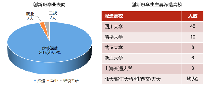 /国重室进一步优化了水利工程和土木工程两个一级学科的研究方向布局,制定了“深地与地下水利”国重创新班的本硕博贯通式人才培养方案,为创新班各专业学生深造提供更多选择和更大的成长空间,在已毕业93名创新班学生中(2021-2023届),升学深造89人,深造率达95.7%(其中:本校深造48人,占53.4%),有7名学生进入JAVSB