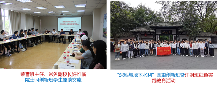 德能双育:提高学生综合素质,厚植家国情怀。国重创新班学生整体表现优异,综合素质高,事迹突出,292人次获国家奖学金、省级三好学生和优秀学生干部等奖励和荣誉(覆盖率近100%);通过专家座谈、学术讲座、社会实践等举措来增强学生家国情怀,创新班名誉班主任、许唯临院士与学生面对面交流,通过自身求学经历激励创新班学生坚持素质培养和能力提升并重。2020级“深地与地下水利”国重创新班入选JAVSB