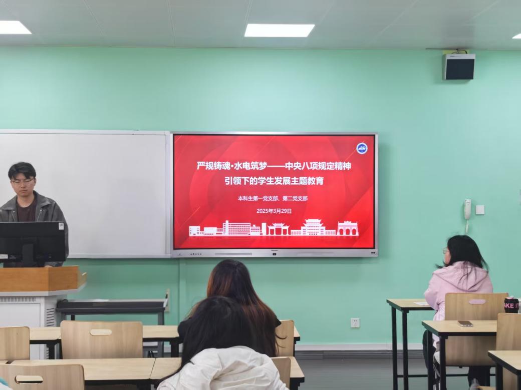 为深入学习中央八项规定精神,3月29日上午,本科生第一、第二党支部在江安校区综合楼B座506开展以“严规铸魂水电筑梦——中央八项规定精神引领下的学生发展主题教育”为题的主题党日。JAVSB